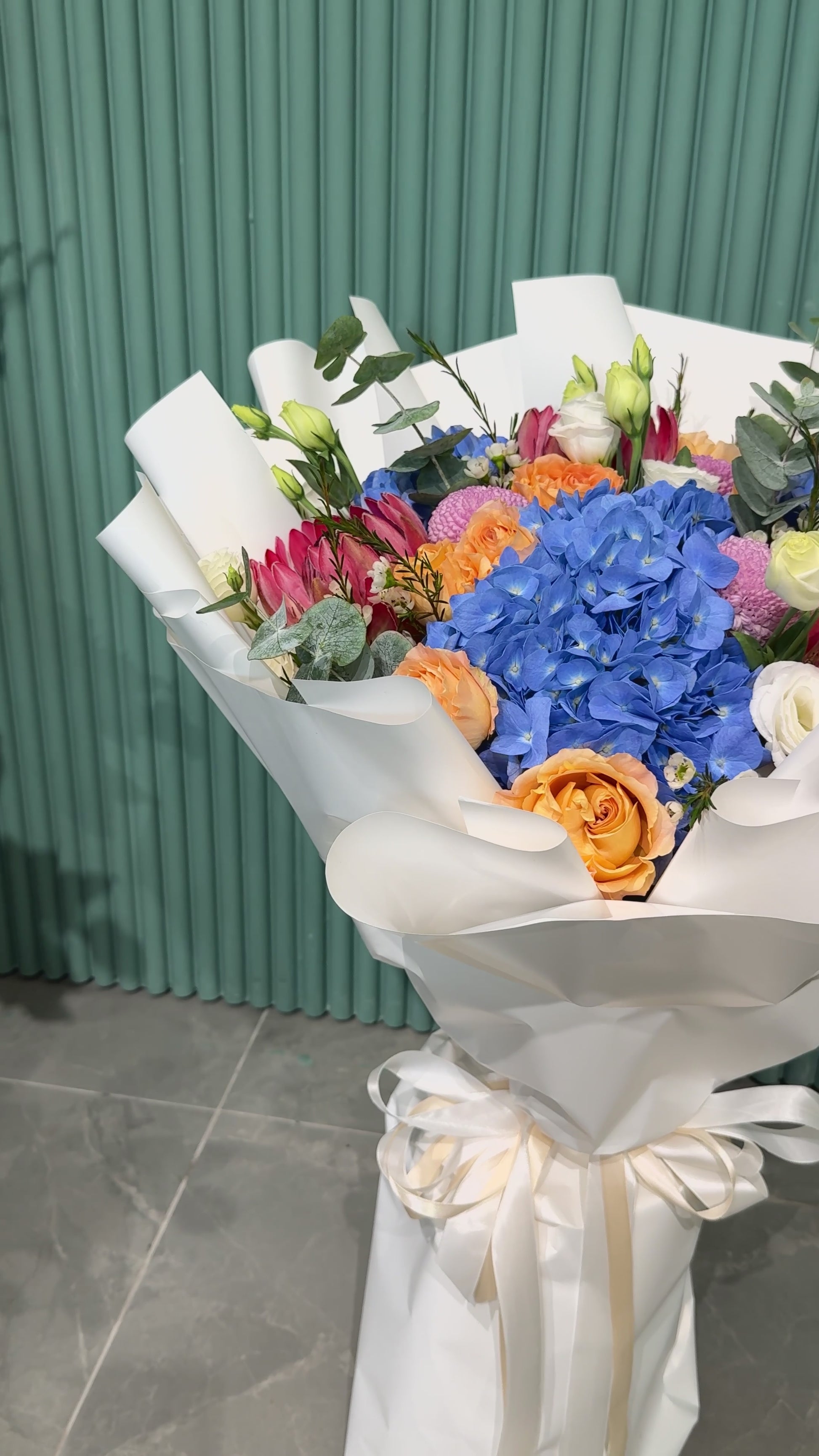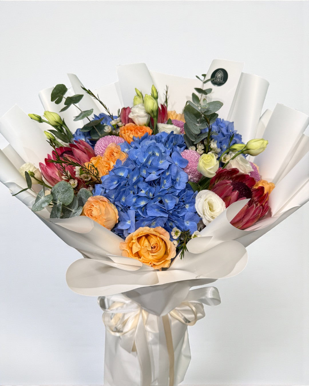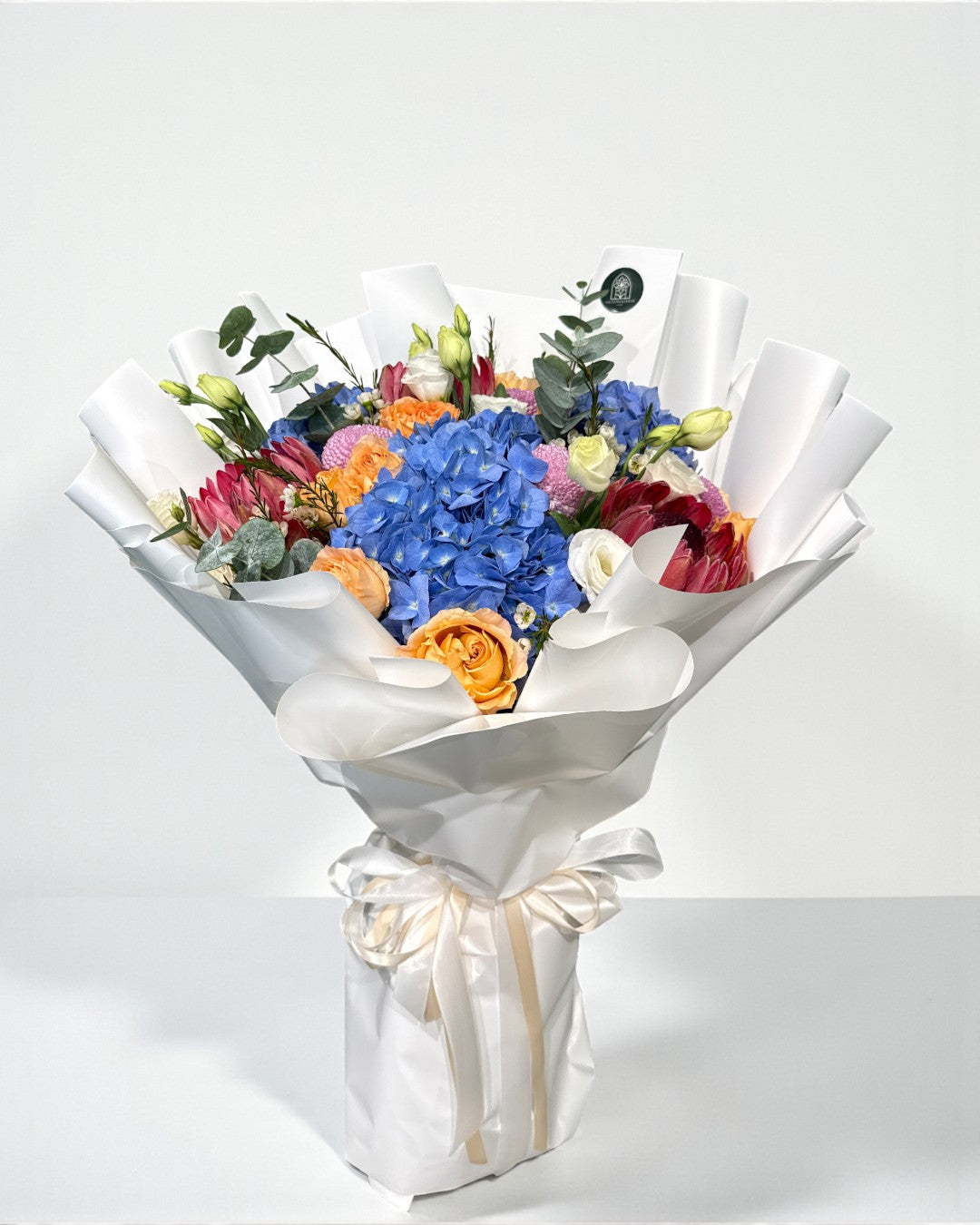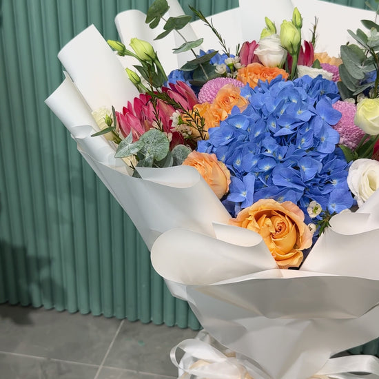 An arresting play of vivid blues, radiant oranges, and soft pastels, this bouquet captures the enchantment of first light. Bold yet balanced, it embodies contemporary luxury—fresh, luminous, and impossible to overlook.