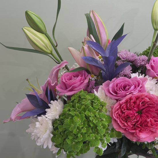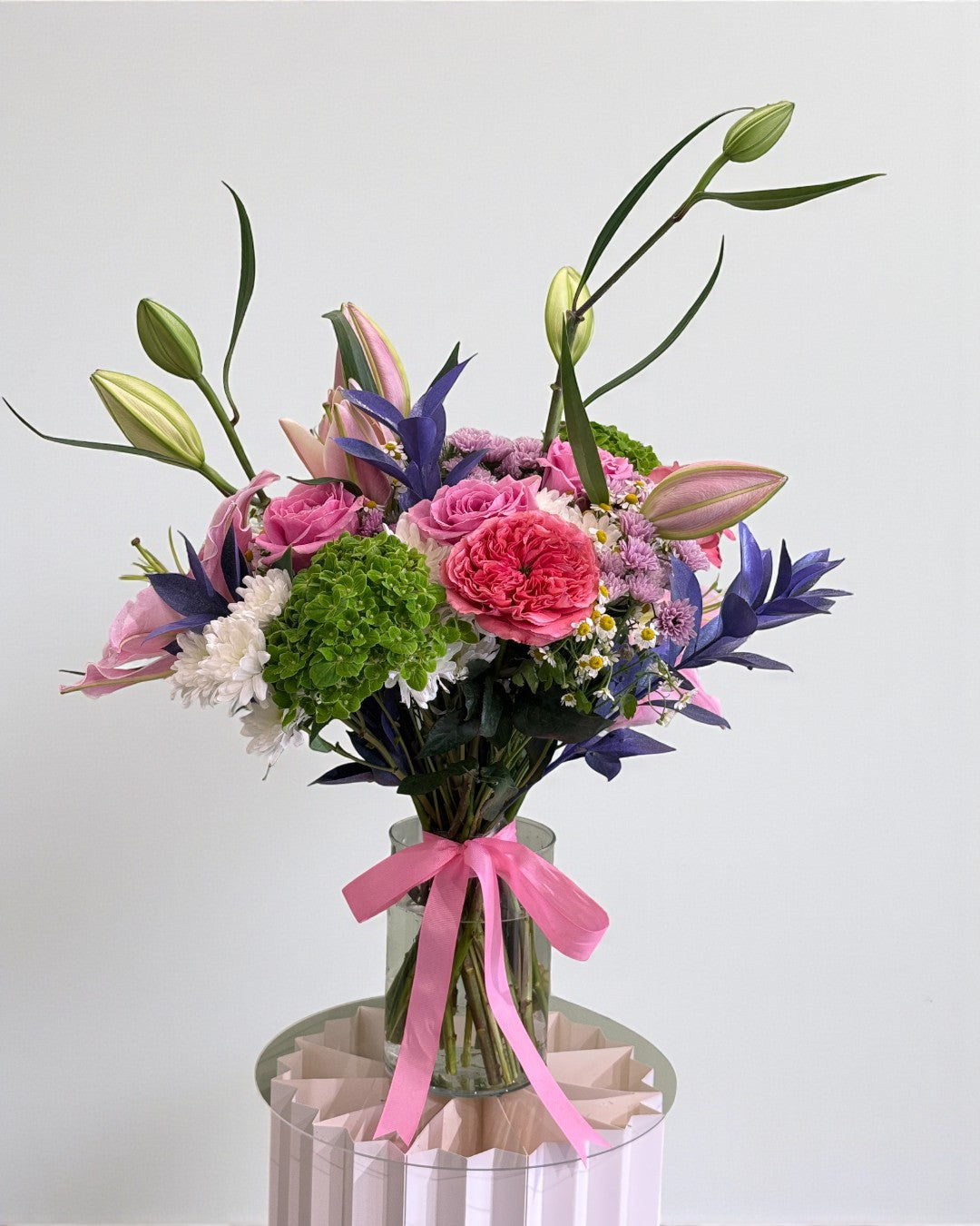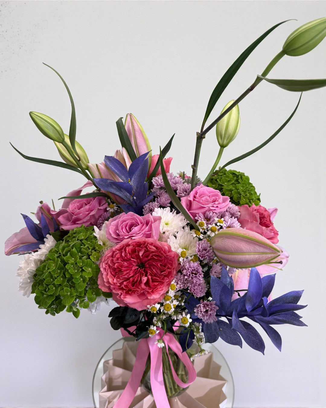 An enchanting blend of pink lilies, lush greens, and jewel-toned accents, this arrangement feels both ethereal and modern. Its sculptural form and vibrant palette bring an air of celestial grace—radiant, feminine, and beautifully composed.