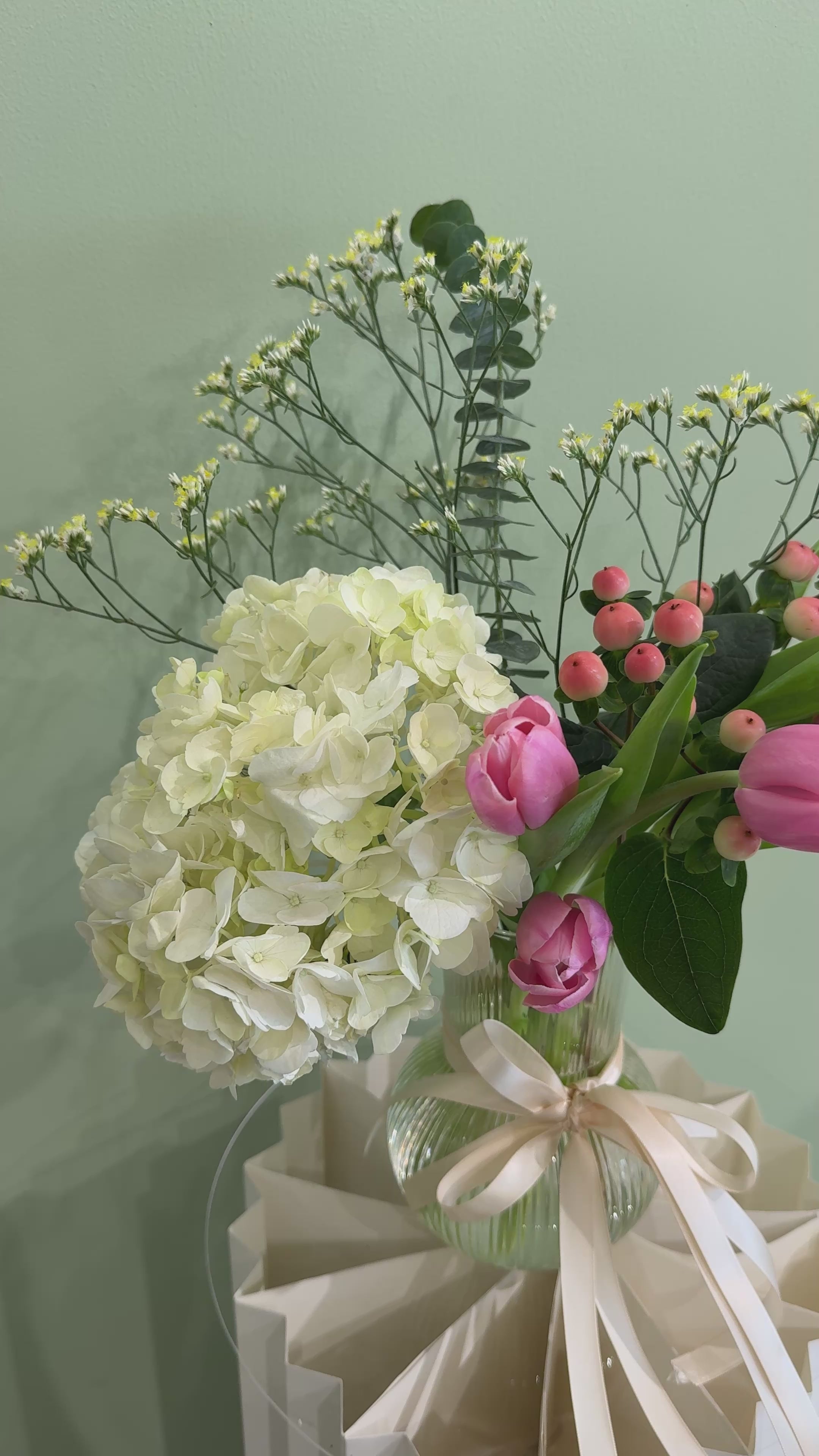 Delicate yet striking, this arrangement balances the purity of white hydrangeas with the playful charm of pink tulips. Fresh, airy, and tastefully refined—it’s a study in modern grace and timeless femininity.