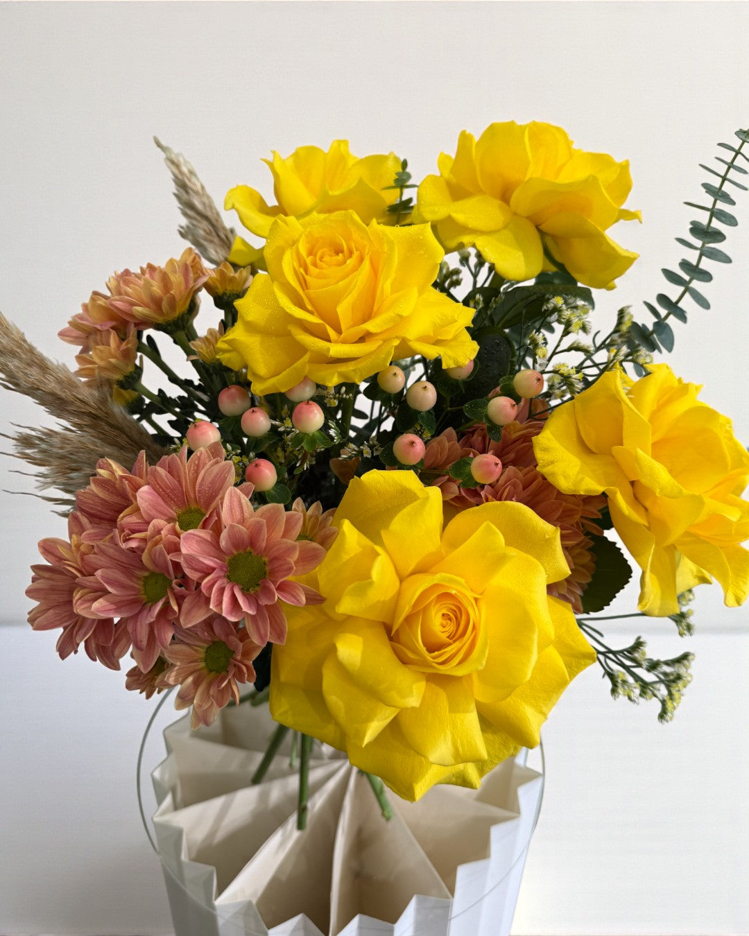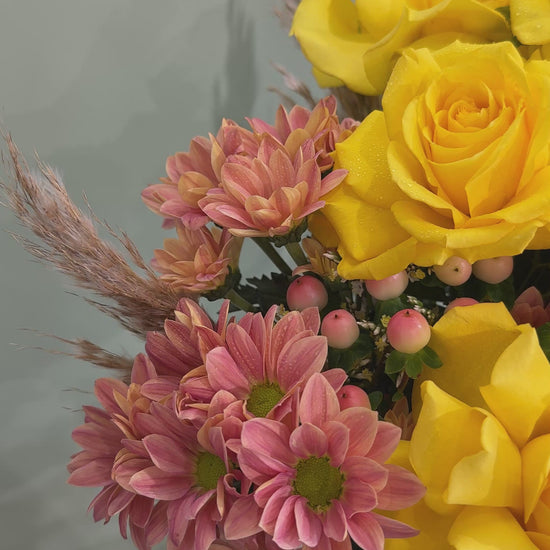 Radiant and full of life, this bouquet glows with golden blooms contrasted by warm, earthy tones. Its sunlit palette and sculptural form bring an effortless touch of joy and modern elegance to any space.