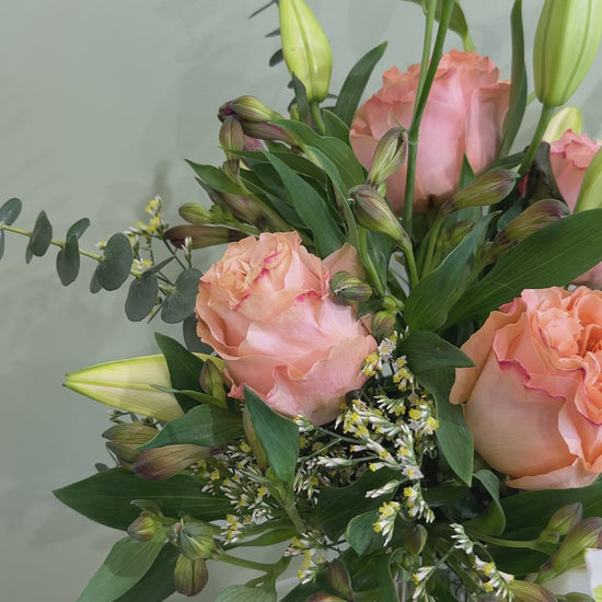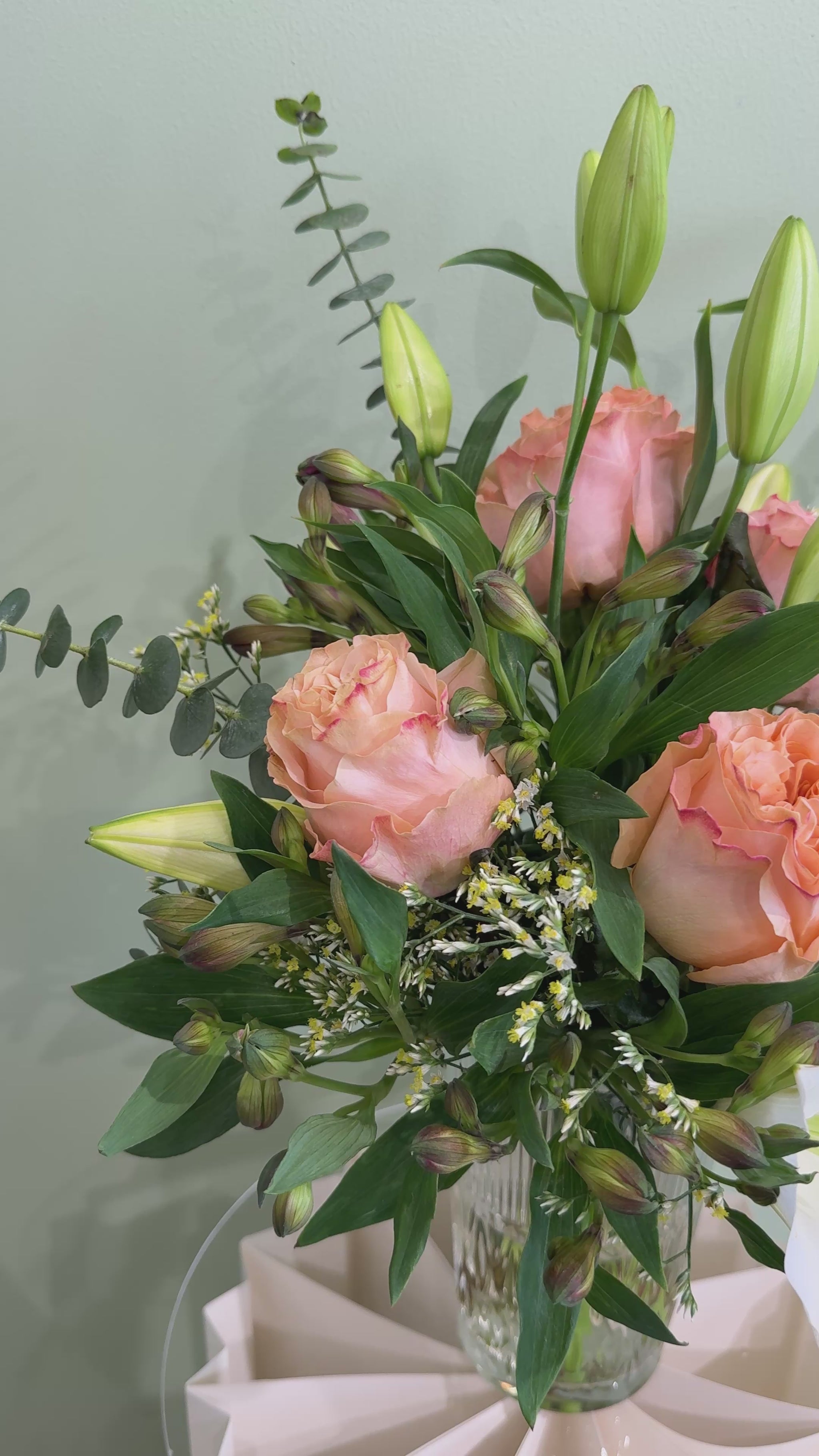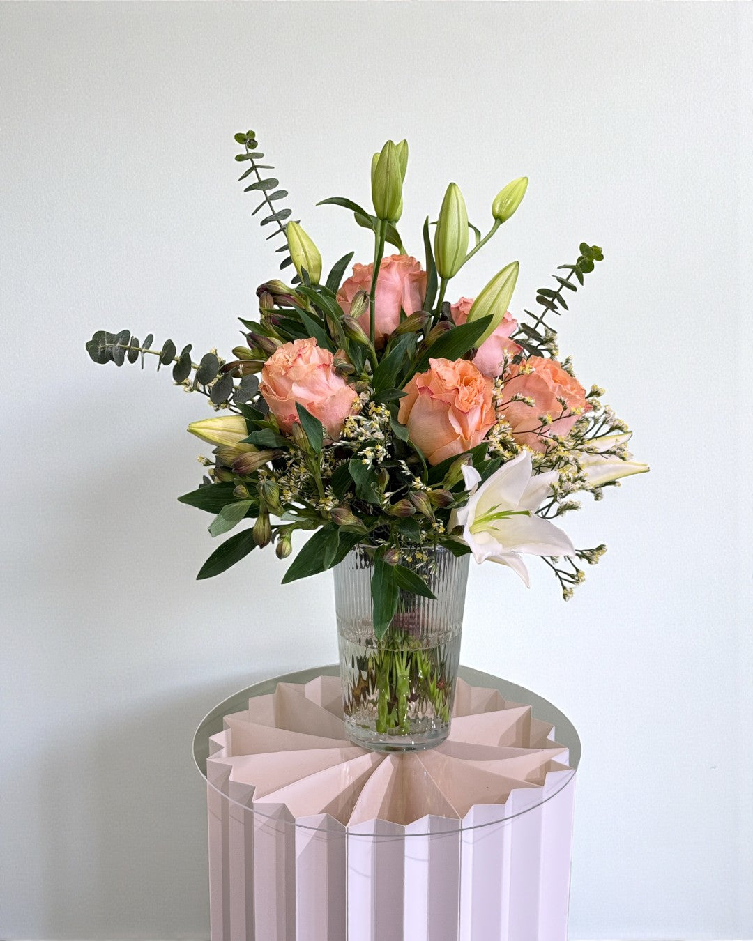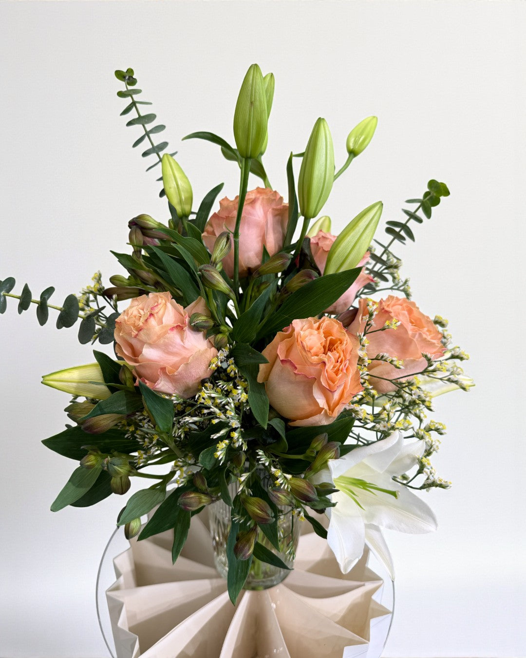 Graceful and ethereal, this vase arrangement marries soft peach roses with pristine lilies and lush greens. A refined expression of serenity and poise, it brings timeless beauty to modern interiors with quiet sophistication.