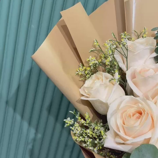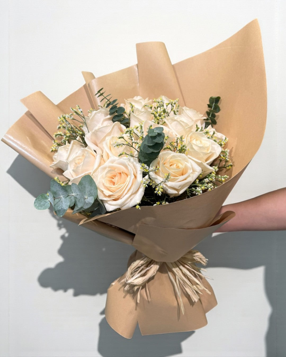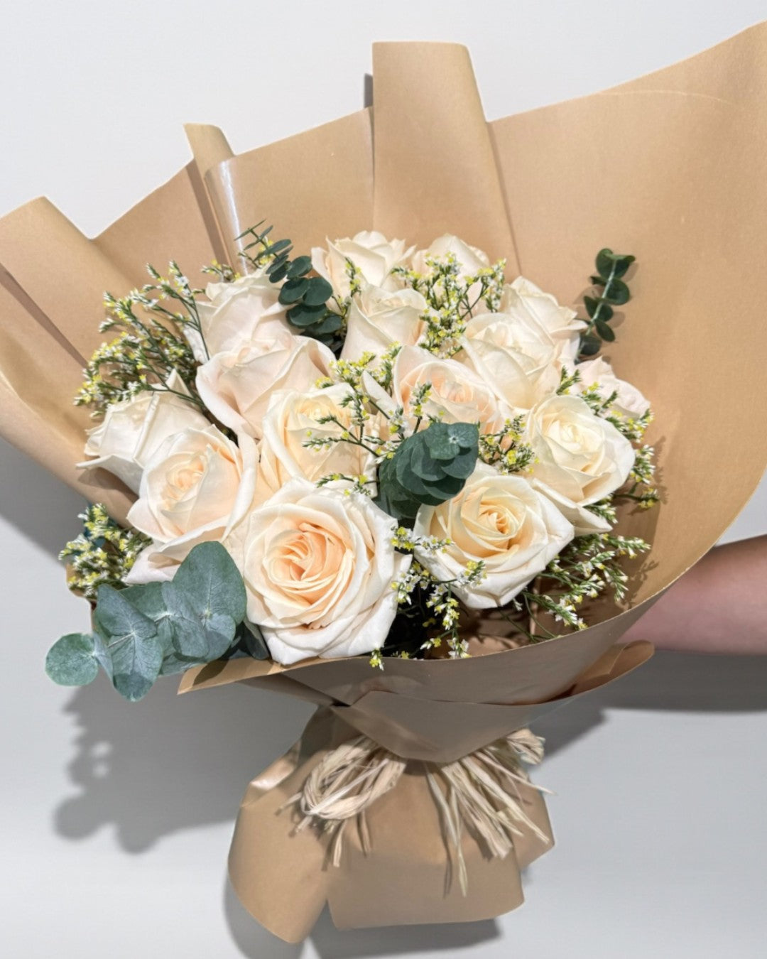 A timeless expression of grace, this bouquet pairs creamy ivory roses with soft foliage for a look that’s pure and poetic. Effortlessly elegant, it embodies calm sophistication and understated luxury.
