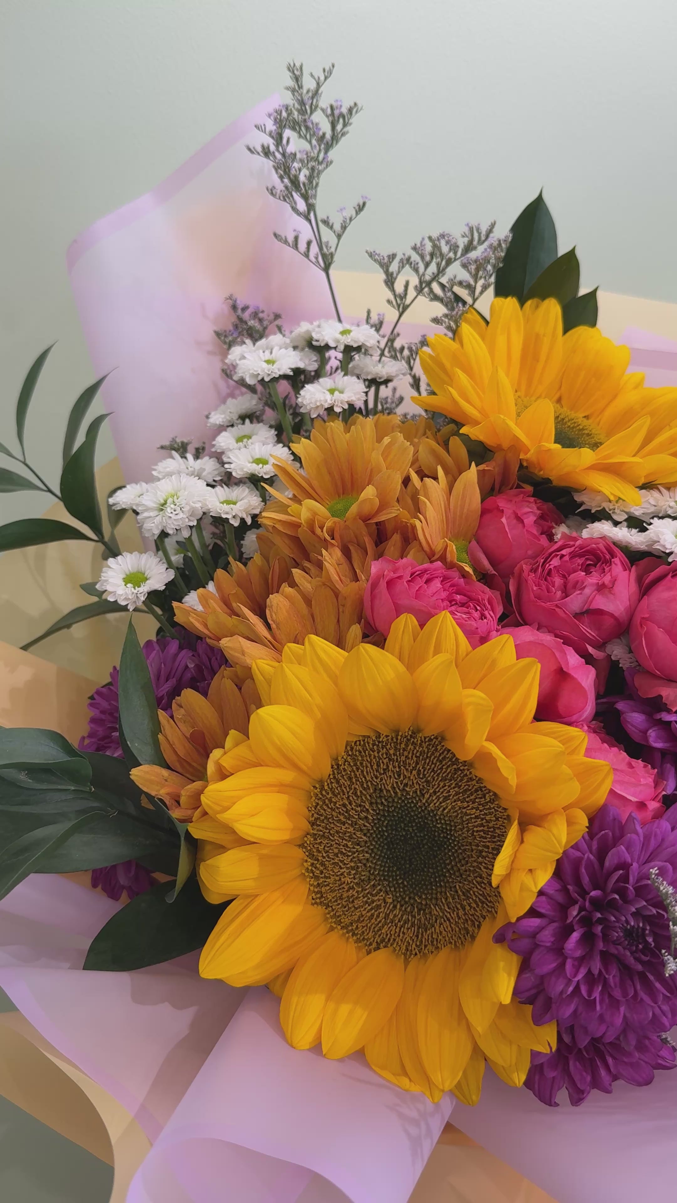 A radiant burst of sunshine and joy, this arrangement blends golden blooms with vibrant pinks and purples for an uplifting, modern statement. Perfectly balanced between warmth and elegance, it brings effortless cheer to any space while exuding refined charm.